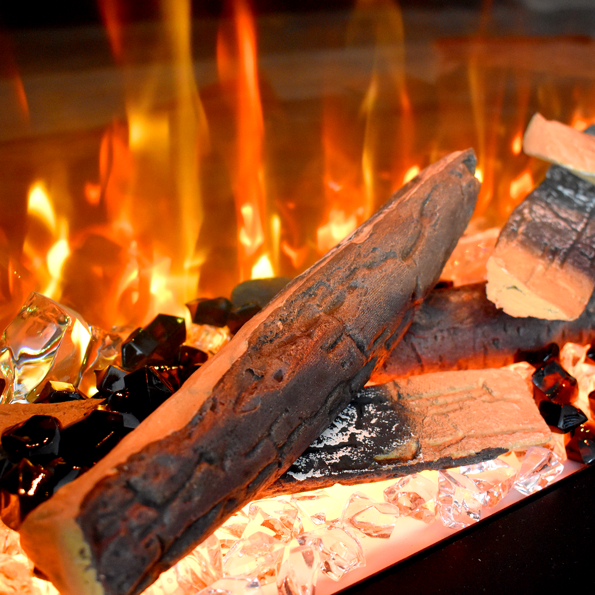 - Inklusive 3 dekorativer Elemente (Holzscheite, Kristallsteine usw.) für Ihr persönliches Feuerbild
